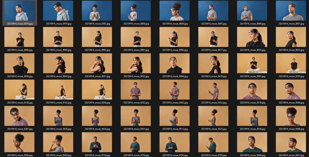 The Muse Press Kit contains ~50 high quality images of people using our product the Muse 2 S (sleep version). This is somewhat just an experiment with a goal of creating new, images in the style of the press kit. New people, new backgrounds, etc. All wearing the same product on their heads.