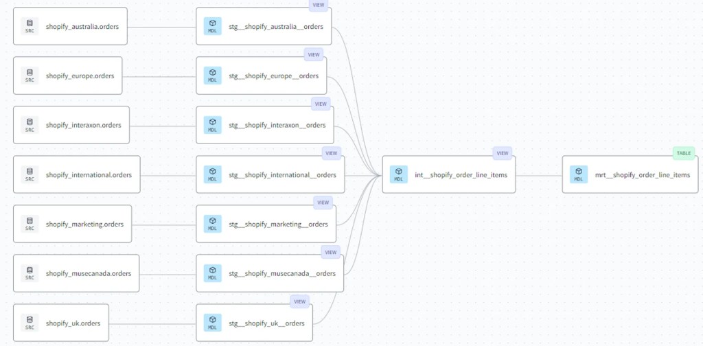The “final” model layer, meant for use in production. This layer has no rules, but I try to be efficient. Everything that didn’t make sense to add in the previous layer goes in here. In our case, we’re adding some USD exchange rate data to help match our financial reporting. This was done after the first round of validation with stakeholders as I learned that they had specific requirements for reporting in USD, opposed to base currencies from each of the Shopify stores.